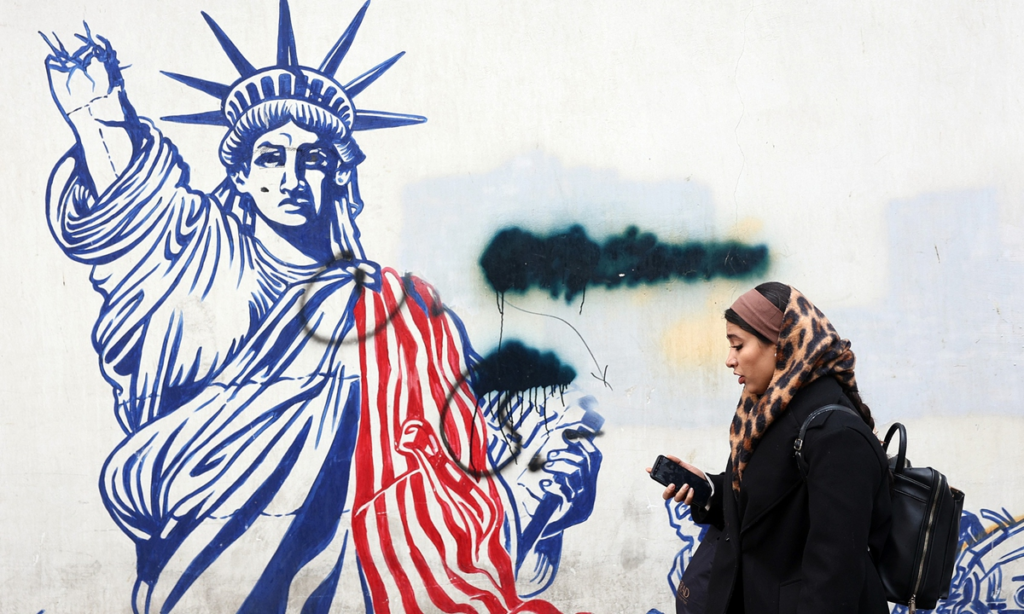 An Iranian woman walks past an anti-US mural on a street in Tehran, Iran, on January 3, 2026.